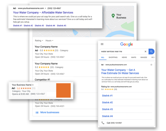 GET A FREE PROPOSALOne of the quickest ways to get your Water Filtration Business at the top of a search engines results page (SERP). These ads will allow your business to be shown when people are searching for your keywords on the SERP, Google Maps, Bing Maps, Gmail, and other search partner's websites. We will strategically research keywords, build your campaigns, write creative and compelling ad copy, and actively manage your campaign by making adjustments and tweaks to improve ROI. Our pay-per-click services include both Google Ads (formerly Google AdWords) and Bing ads.